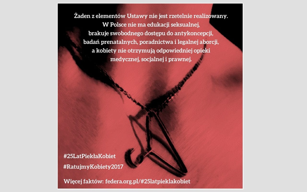 Obowiązująca od 25 lat Ustawa o planowaniu rodziny, ochronie płodu ludzkiego i warunkach dopuszczalności przerywania ciąży ma fikcyjny charakter i zaprzecza światopoglądowej neutralności państwa. To właściwa okazja, by przypomnieć dowody na szkodliwość oraz pogłębić dyskusję o liberalizacji prawa. Szczególnie, że już na 9 stycznia zaplanowana jest w Sejmie debata obywatelskiego projektu ustawy o prawach kobiet i świadomym macierzyństwie Komitetu Inicjatywy Ustawodawczej „Ratujmy Kobiety 2017”. Te dwa wydarzenia stanowią przyczynek do naszej kampanii #25LatPiekłaKobiet, która podsumowuje wady i negatywne skutki Ustawy oraz przedstawia argumenty za wprowadzeniem kompleksowych rozwiązań w zakresie świadomego rodzicielstwa i praw reprodukcyjnych. Śledź na Facebooku i Twitterze memy z hashtagiem #25LatPiekłaKobiet, by poznać kolejne fakty i dzielić się wiedzą.