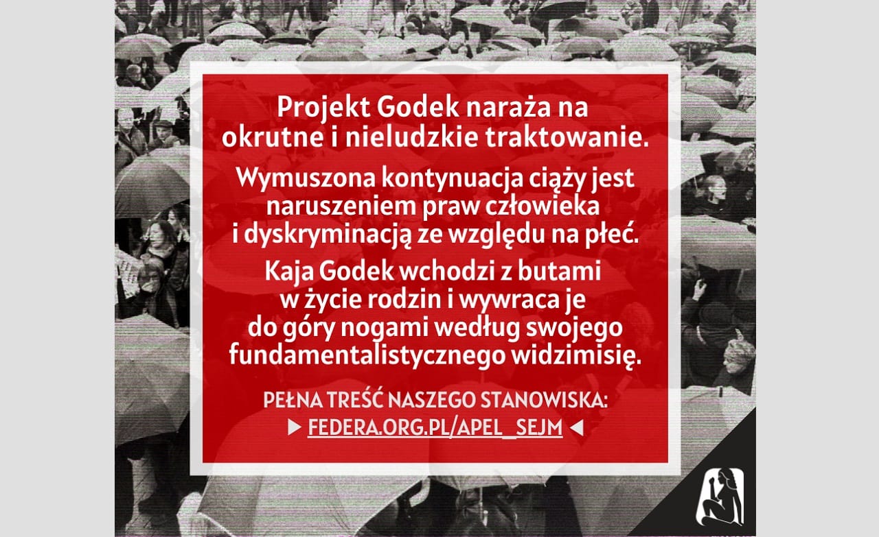 Polska jest jedynym dużym państwem europejskim z tak represyjnymi przepisami antyaborcyjnymi. 98% legalnych aborcji wykonuje się z powodu “ciężkiego i nieodwracalnego upośledzenia płodu lub choroby zagrażającej jego życiu”, czyli jednej z trzech przesłanek ustawy o planowaniu rodziny. Projekt Kai Godek dąży do zdelegalizowania tej przesłanki i oznacza w praktyce całkowity zakaz aborcji i przymus rodzenia w najtragiczniejszych sytuacjach. Zaostrzenie obowiązującego prawa odbije się negatywnie na zdrowiu fizycznym i psychicznym kobiet. Odbierze im wolność i autonomię podejmowania decyzji dotyczących swojego życia prywatnego. Projekt Godek naraża na okrutne i nieludzkie traktowanie. Wymuszona kontynuacja ciąży jest naruszeniem praw człowieka i dyskryminacją ze względu na płeć. Kaja Godek wchodzi z butami w życie rodzin i wywraca je do góry nogami według swojego fundamentalistycznego widzimisię.