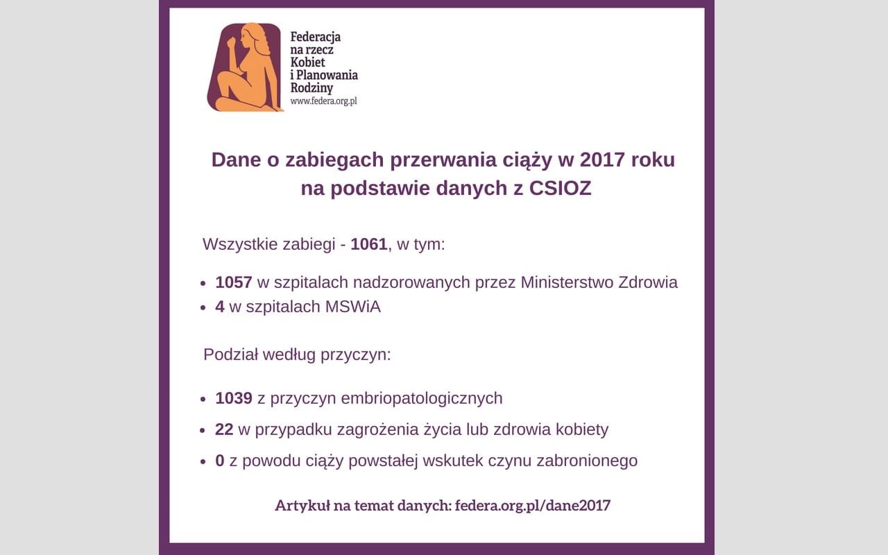 „1061 zabiegów przerywania ciąży wykonano w polskich szpitalach w 2017 roku, w tym 1039 z przyczyn embriopatologicznych” – wynika z danych pozyskanych przez Federację na rzecz Kobiet i Planowania Rodziny w drodze wniosku o dostęp do informacji publicznej. Kilkuprocentowy spadek względem 2016 roku (1098 zabiegów) może wydawać się marginalny. Warto jednak zauważyć, że liczba aborcji z powodu zagrożenia zdrowia lub życia kobiety zmalała o 60% (22 przypadków w 2017 vs. 55 w 2016 r.), osiągając najniższy poziom od 1993 roku, gdy w życie weszła ustawa o planowaniu rodziny. W obliczu zagrożenia swojego zdrowia lub życia kobiety nie chcą ryzykować bezprawnej odmowy lekarzy i wyjeżdżają poza granice Polski, aby tam bezpiecznie dokonać aborcji. W 2017 roku nie przeprowadzono żadnego zabiegu w przypadku ciąży powstałej w wyniku czynu zabronionego.