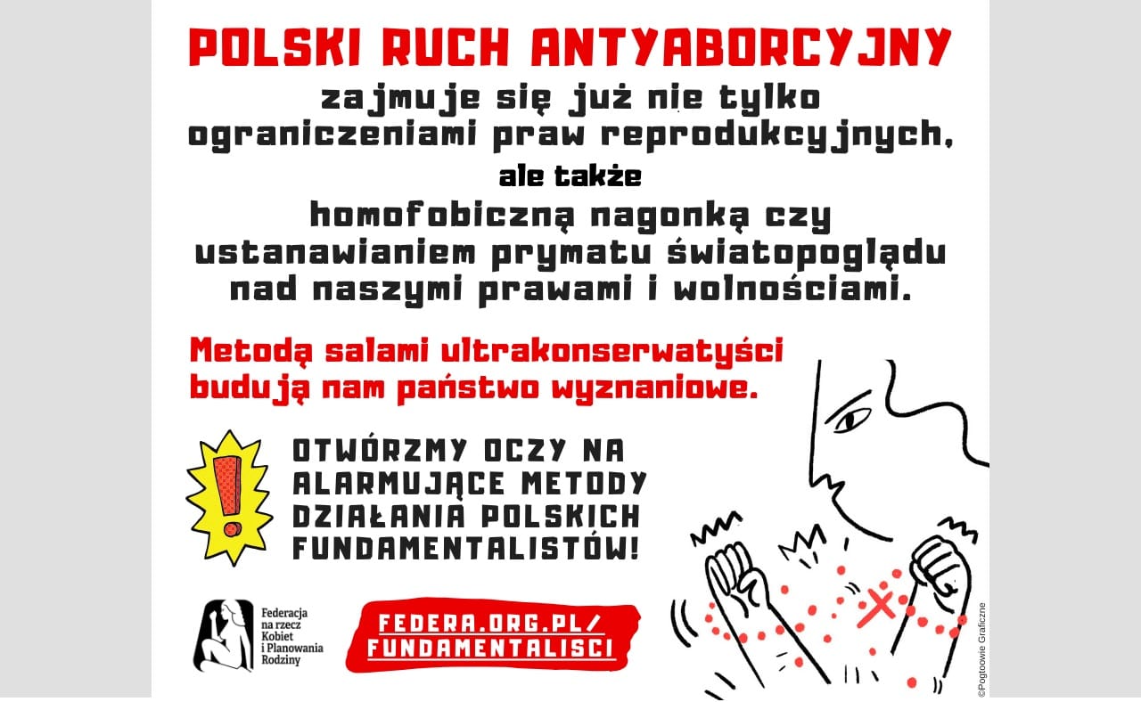 Od kilku lat Polska stale spada w międzynarodowych rankingach mierzących jakość demokracji czy wolność mediów[1]. Równocześnie w siłę rosną organizacje fundamentalistyczne, których działania rozszerza się na kolejne obszary życia – tak publicznego, jak i prywatnego. Polski ruch antyaborcyjny zajmuje się już nie tylko ograniczeniami praw reprodukcyjnych, ale także homofobiczną nagonką na próby wzmacniania praw osób nieheteronormatywnych czy ustanawianiem prymatu światopoglądu nad prawami i wolnościami polskiego społeczeństwa[2]. Metodą salami ultrakonserwatyści budują nam państwo wyznaniowe. Otwórzmy oczy na alarmujące metody działania polskich fundamentalistów.