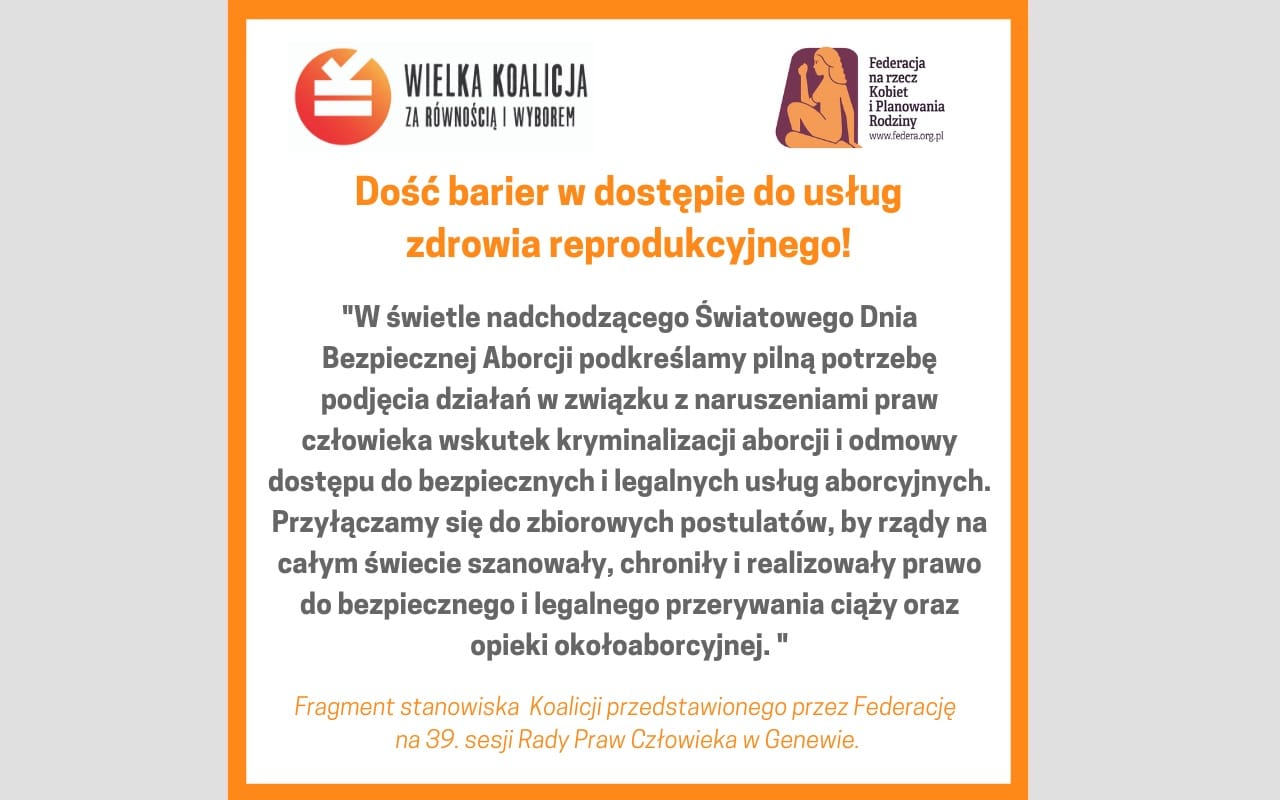„Państwa powinny uznać, że decyzje kobiet o swoim ciele są osobiste i prywatne, oraz umieścić autonomię kobiet w centrum kształtowanie polityki i stanowienie prawa w obszarze usług zdrowia seksualnego i reprodukcyjnego, w tym opieki aborcyjnej”, podkreśla Koalicja w stanowisku przedstawionym przez Federację na rzecz Kobiet i Planowania Rodziny z okazji Światowego Dnia Bezpiecznej Aborcji podczas 39. sesji Rady Praw Człowieka w Genewie.