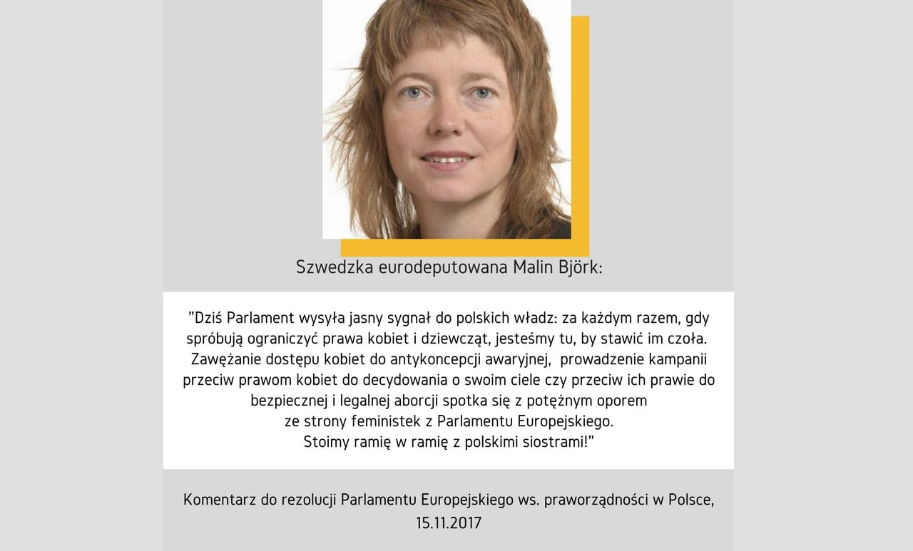 Za przyjęciem rezolucji, a tym samym zainicjowaniem procedury zmierzającej do uruchomienia art. 7 traktatu wobec Polski, opowiedziało się 66% eurodeputowanych. Barbara Spinelli, sprawozdawczyni pomocnicza, wyjaśniała, że to działania PE wynikało z obowiązku zapewnienia, że fundamenty obywatelstwa – prawa człowieka i podstawowe wolności – są w pełni zagwarantowane. Szwedka europosłanka Malin Björk dodała: „Dziś Parlament wysyła jasny sygnał do polskich władz: za każdym razem, gdy spróbują ograniczyć prawa kobiet i dziewcząt, jesteśmy tu, by stawić im czoła. Zawężanie dostępu kobiet do antykoncepcji awaryjnej, prowadzenie kampanii przeciw prawom kobiet do decydowania o swoim ciele czy przeciw ich prawie do bezpiecznej i legalnej aborcji spotka się z potężnym oporem