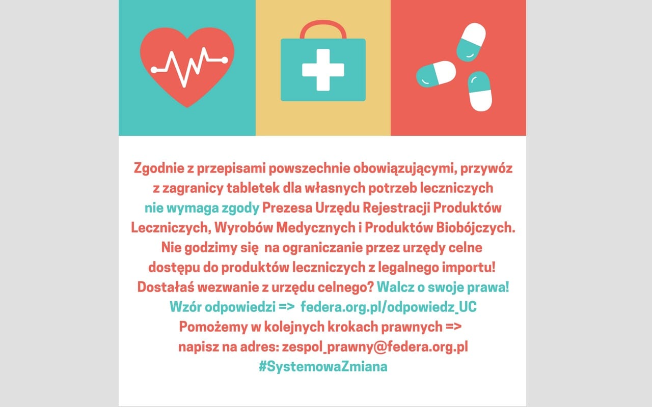 Jak wyjaśniała nasza prawniczka, z najnowszego orzeczenia Naczelnego Sądu Administracyjnego wynika, że import produktów leczniczych na użytek własny oznacza przywiezienie leku osobiście przy sobie, w walizce, a nie poprzez kuriera. To w praktyce oznacza niemożność ściągnięcia pigułek z zagranicy, ale odpowiednią argumentacją można, a wręcz należy, próbować przekonać sądy do zmiany tej linii orzeczniczej. Nie istnieją bowiem powody, dla których prawa pacjentów lub konsumentów do przywozu pięciu najmniejszych opakowań produktu leczniczego na własne potrzeby lecznicze miałyby być różnicowane ze względu na środek transportu produktów: osobisty we własnym bagażu lub za pośrednictwem kuriera/wysyłki pocztowej. Na razie nie zapadło dużo takich wyroków. Osoby, które dostaną takie wezwania lub decyzje z urzędu celnego, gorąco zachęcamy do kontaktu z Zespołem Prawnym Federacji zespol_prawny@federa.org.pl #SystemowaZmiana